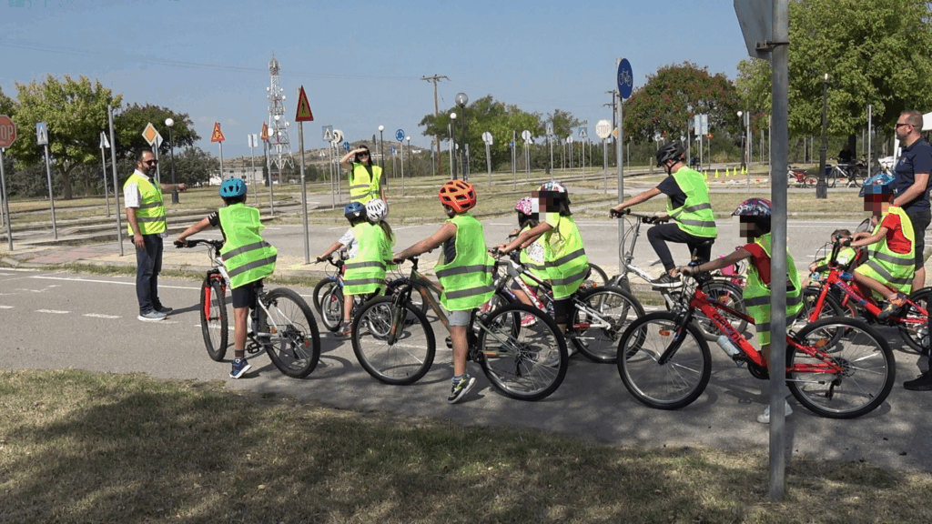 Στο πρακτικό μέρος της εκπαίδευσης, οι μαθητές παρακολουθούν με προσοχή τις οδηγίες των εκπαιδευτών και την επεξήγηση των σημάτων, πριν ξεκινήσουν την προσομοιωμένη κυκλοφορία με ποδήλατα στο πάρκο κυκλοφοριακής αγωγής.